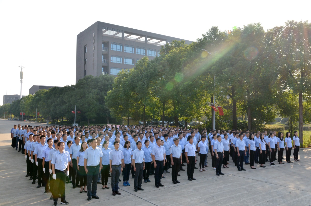 2019年9月30日早晨,一輪紅日從東方升起,給大地涂抹上一層金輝。天門紡機(jī)400多名員工在公司廣場列成方隊,為即將舉行的升國旗、唱國歌活動作準(zhǔn)備。