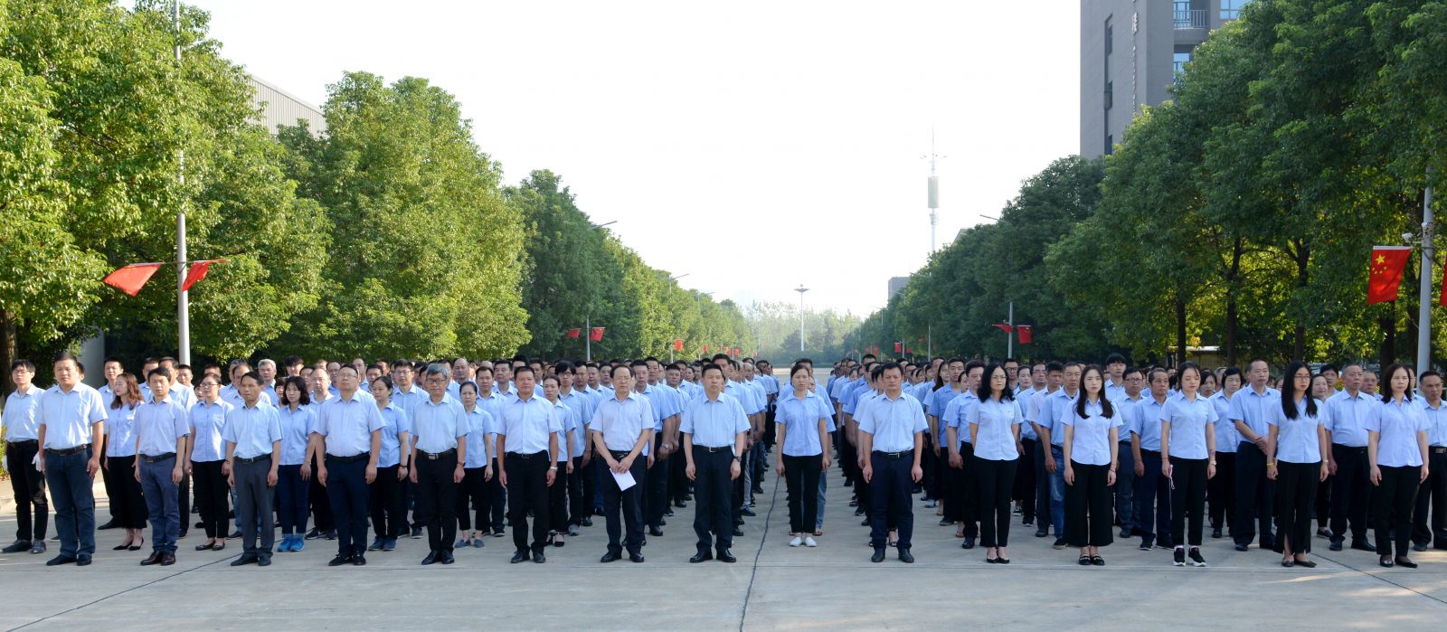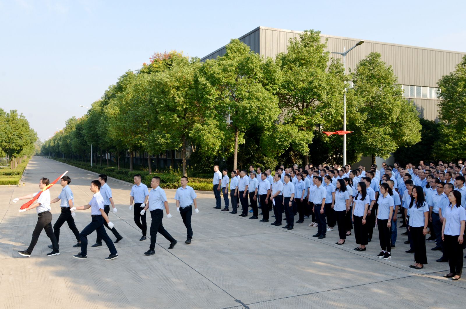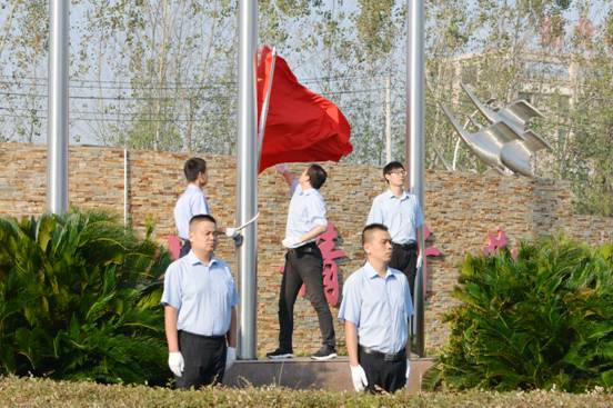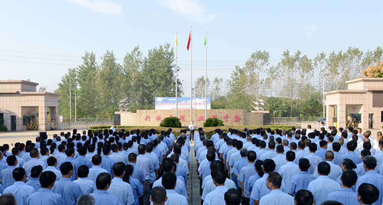 8:20時,活動儀式在總經(jīng)理焦倫進(jìn)的主持下啟動,七名旗手邁正步從員工方隊繞過,直達(dá)旗壇,行進(jìn)口令威武響亮。在主持人的指令下,三名旗手將一面鮮艷的五星紅旗在莊嚴(yán)的國歌聲中徐緩地升上天空,員工方隊注目國旗,唱起雄壯的國歌。
