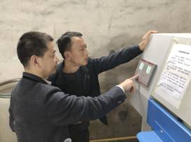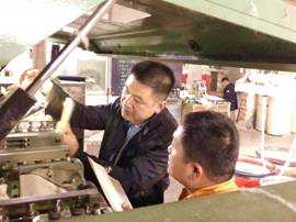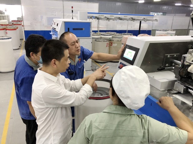 天門(mén)紡機(jī)專(zhuān)家團(tuán)隊(duì)成員樊早斌、楊義兵、于少波、楊文峰在工作現(xiàn)場(chǎng)