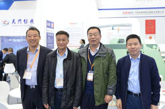 中紡聯(lián)黨委書記、秘書長(zhǎng)高勇(左3)、中紡聯(lián)副會(huì)長(zhǎng)楊紀(jì)朝(右2)、中國紡織機(jī)械協(xié)會(huì)總工程師祝憲民(左1)在天門紡機(jī)展位上合影