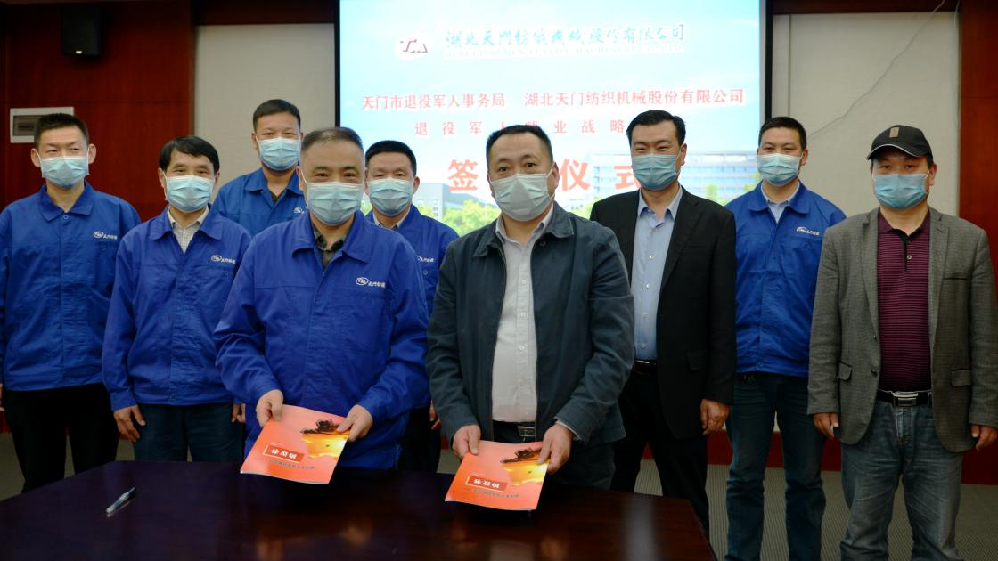 4月23日下午,天門市退役軍人事務(wù)局與天門紡機(jī)舉行退役軍人就業(yè)戰(zhàn)略合作簽約儀式,天門市退役軍人事務(wù)局副局長(zhǎng)李文超、天門紡機(jī)總經(jīng)理焦倫進(jìn)分別代表雙方簽約。