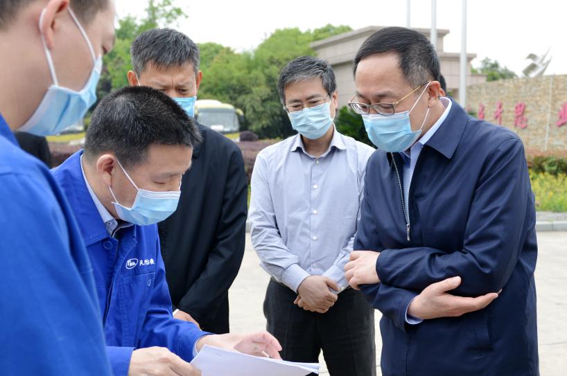 沈方勇董事長(zhǎng)向國(guó)家衛(wèi)健委副主任于學(xué)軍(右1),國(guó)家衛(wèi)健委衛(wèi)生應(yīng)急辦公室監(jiān)察專員張國(guó)新(右2)等領(lǐng)導(dǎo)匯報(bào)天門(mén)紡機(jī)復(fù)工復(fù)產(chǎn)疫情防控情況
