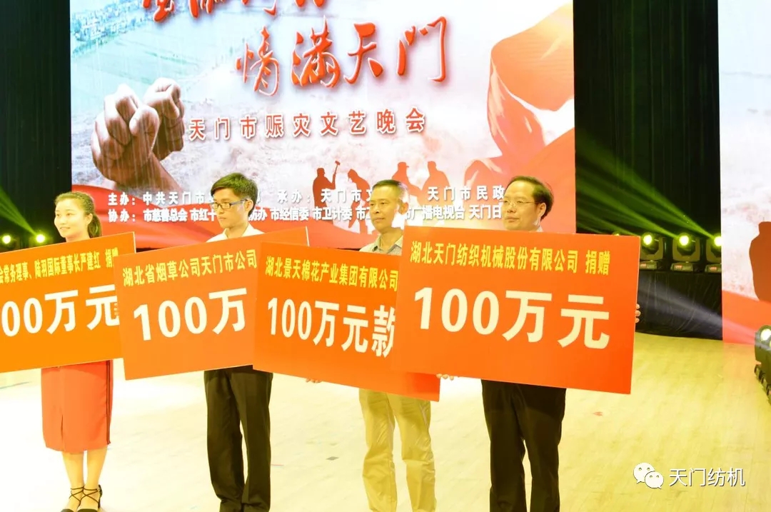 2016年,天門全市遭遇百年一遇的特大洪澇災(zāi)害,人民生命財(cái)產(chǎn)受到嚴(yán)重威脅。天門紡機(jī)積極參與政府組織的抗洪救災(zāi)慰問活動,為奮戰(zhàn)在一線的防汛抗災(zāi)人員送去食品、藥品和救災(zāi)物資,并捐贈100萬元抗洪救災(zāi)款。
