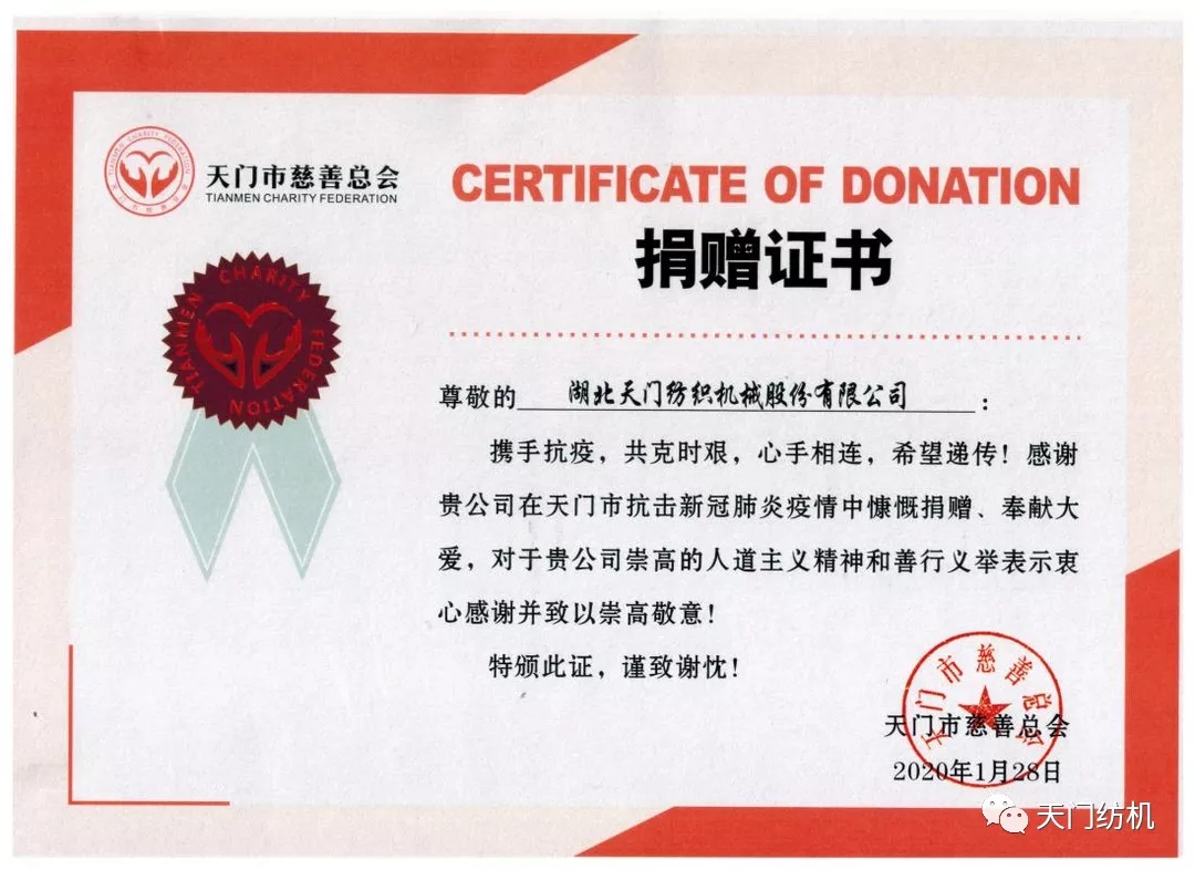 2020年,面對來勢洶洶的新冠疫情,作為一家民營企業(yè),天門紡機(jī)不計(jì)經(jīng)濟(jì)損失,率先提出了“不給黨和政府添麻煩,不給疫情防控添壓力,不給社會就業(yè)添負(fù)擔(dān)”,率先停產(chǎn)歇業(yè),率先捐贈100萬元,專門用于收治新冠患者,采購短缺醫(yī)療物資。公司管理層還通過多種渠道,主動與有影響力基金會取得聯(lián)絡(luò),分6個(gè)批次向醫(yī)院、社區(qū)捐贈了30萬只醫(yī)用口罩、10噸醫(yī)用消毒液、2萬件防護(hù)服等大量物資,在抗疫的危急時(shí)刻發(fā)揮了重要作用。