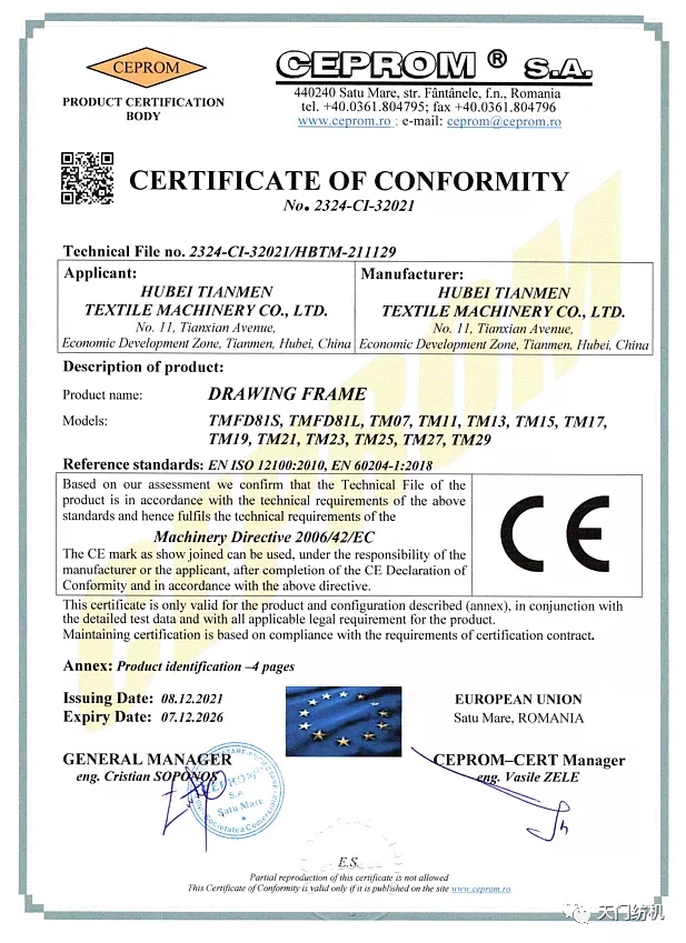 面對進(jìn)入歐盟市場的機(jī)遇和挑戰(zhàn),天門紡機(jī)積極探索和研究并條機(jī)出口歐盟成員國的可行性,尤其針對“CE”認(rèn)證對裝備制造業(yè)提出的高標(biāo)準(zhǔn)、嚴(yán)要求,在不斷完善產(chǎn)品質(zhì)量及安全管理基礎(chǔ)上,完成了大量技術(shù)文件的翻譯、整理、歸集和申報(bào)工作,公司核心產(chǎn)品的質(zhì)量、技術(shù)水平、可靠性、穩(wěn)定性、安全性已達(dá)到國際標(biāo)準(zhǔn),更是對天門紡機(jī)品質(zhì)管理、專業(yè)能力、多維度綜合實(shí)力的肯定,打造了良好的品牌形象,增強(qiáng)了海外市場影響力。