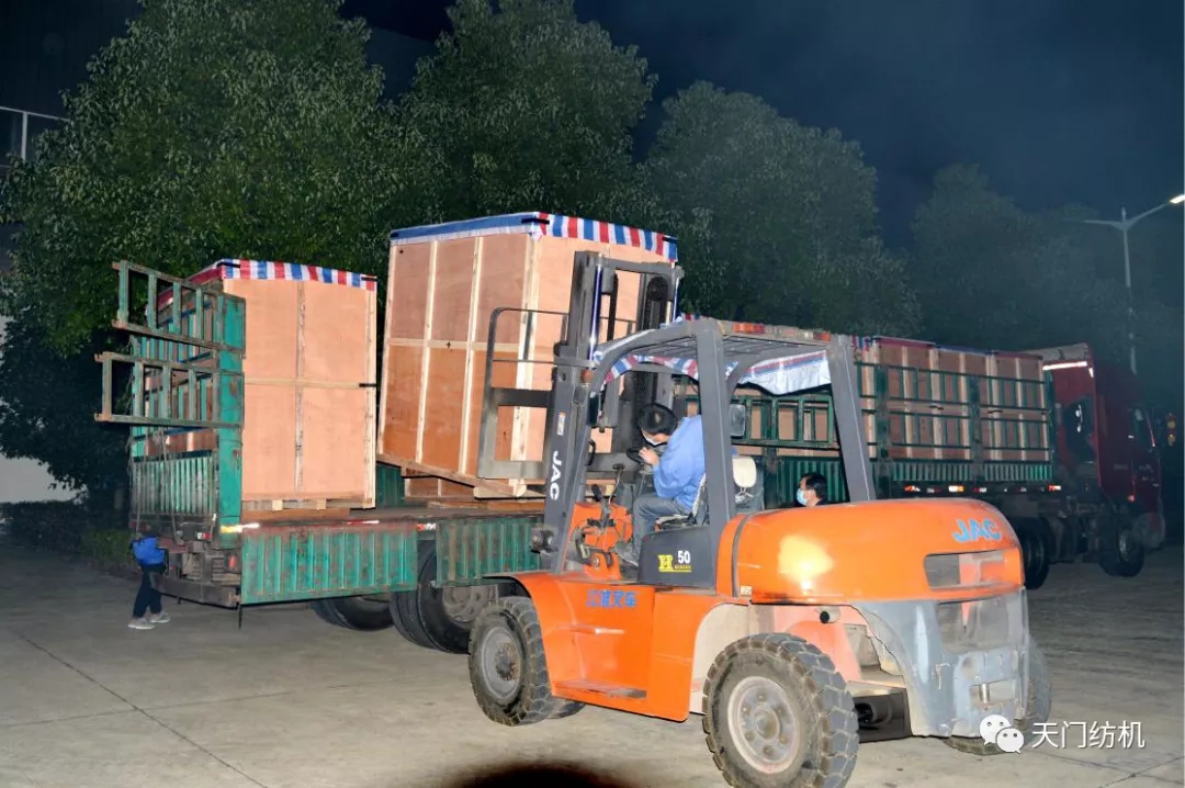 燈火闌珊處,機器轟鳴聲。已是臘月二十一的晚上,天下著冷冷細雨,神州大地處處已有年味,但在天門紡機廠區(qū)仍然一派繁忙景象:數(shù)萬平米的車間內全都燈火輝煌,工人們緊張有序的在工作;車間外,幾輛大貨車一字形排開,正在上貨發(fā)往淮北華孚和魯泰紡織。