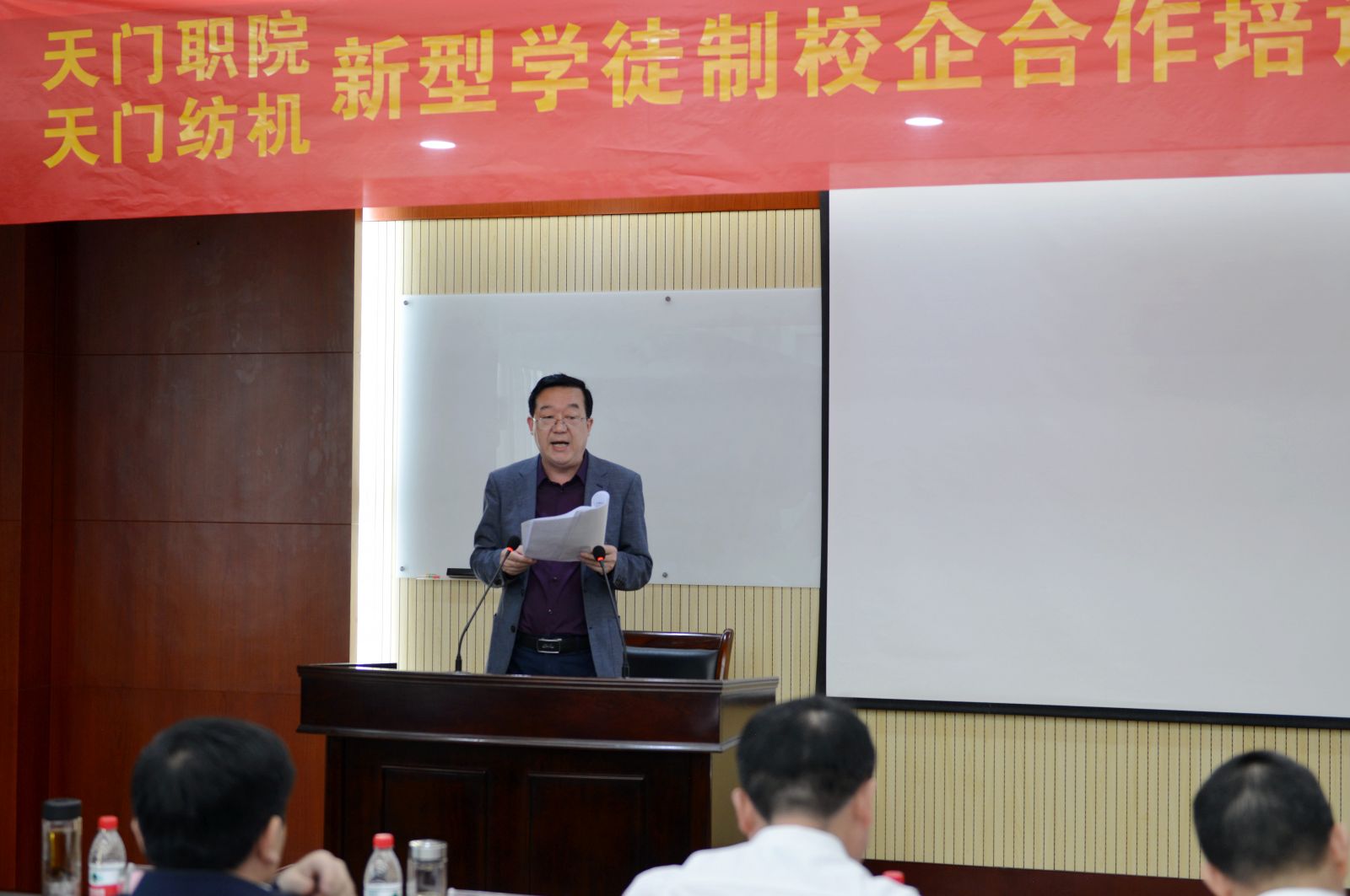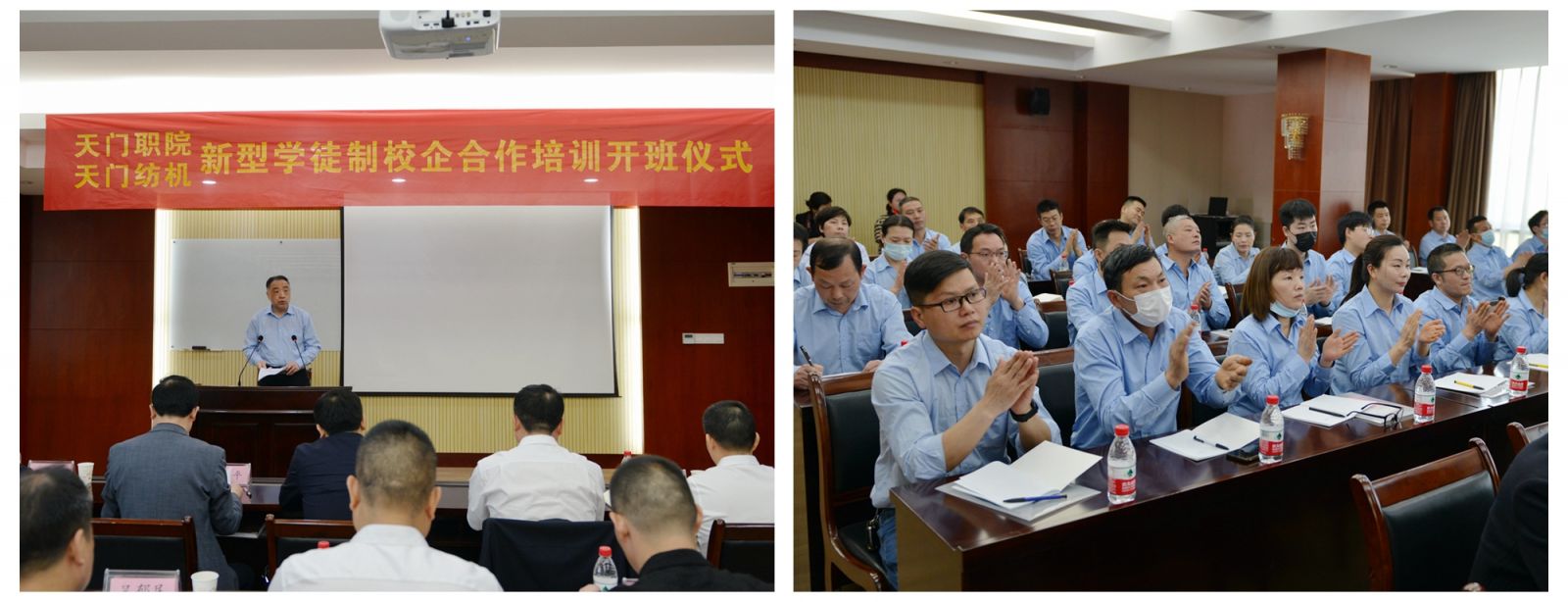 天門紡機黨委書記魯?shù)挛慕榻B了《天門職院與天門紡機新型學徒制培訓方案》,天門職業(yè)學院教師何漢兵作了發(fā)言,他代表全體培訓教師表態(tài),一定不負期望,精心備課,靈活施教,圓滿完成教學任務。