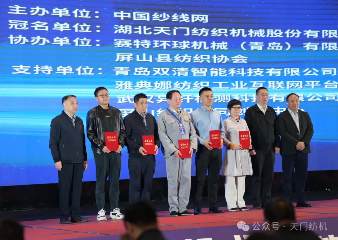 在領導和嘉賓致辭之后,舉行了“天門紡機杯”第12屆全國紡紗技術(shù)創(chuàng)新研討會論文頒獎活動。中國紡織機械協(xié)會會長顧平、中國紗線網(wǎng)總編王果剛、天門紡機總經(jīng)理焦倫進為獲獎作者頒獎。