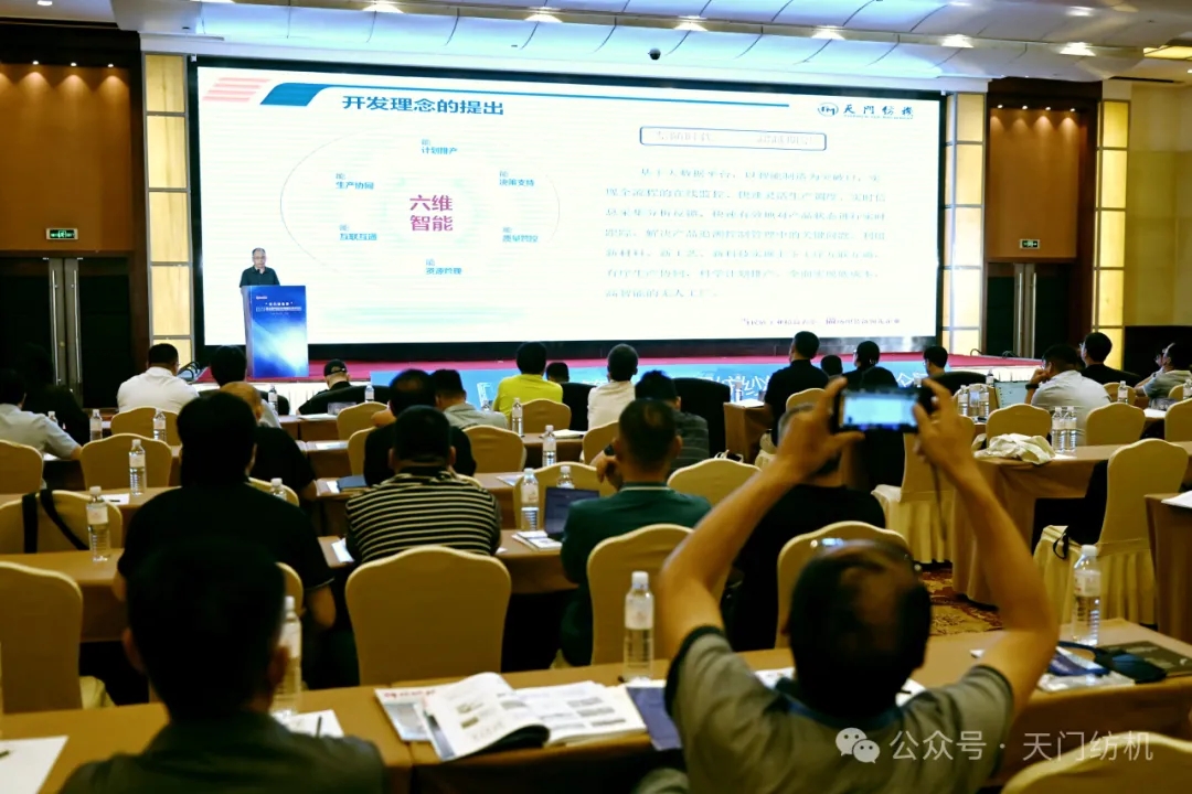 在技術(shù)交流環(huán)節(jié)中,天門紡機品控總監(jiān)樊早斌作了題為《六維智能開創(chuàng)并條產(chǎn)線聯(lián)動新時代》的主旨報告。他深入闡述了產(chǎn)線聯(lián)動的理念、研發(fā)背景和思路,詳實介紹了基于六維智能的并條創(chuàng)新技術(shù)以及產(chǎn)線聯(lián)動的實踐應(yīng)用與開發(fā)進(jìn)程。他強調(diào),“六維智能”開發(fā)理念的提出是基于大數(shù)據(jù)平臺,其創(chuàng)新點就是以智能制造為突破口,實現(xiàn)全流程的在線監(jiān)控、快速靈活生產(chǎn)調(diào)度、實時信息采集分析反饋,快速有效地對產(chǎn)品狀態(tài)進(jìn)行實時跟蹤,解決產(chǎn)品追溯控制管理中的關(guān)鍵問題;利用新材料、新工藝、新科技實現(xiàn)上下工序互聯(lián)互通,有序生產(chǎn)協(xié)同,科學(xué)計劃排產(chǎn),全面實現(xiàn)低成本、高智能的無人工廠。