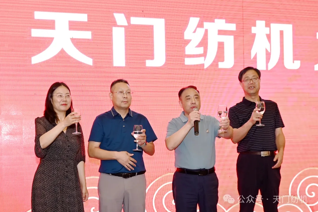 陜西省紡織科學(xué)研究院有限公司黨委書記、總經(jīng)理徐遠(yuǎn)志,天門紡機總經(jīng)理焦倫進(jìn),天門紡機副總經(jīng)理肖少華,《棉紡織技術(shù)》期刊社副總經(jīng)理冉軍麗答謝晚宴共同祝酒