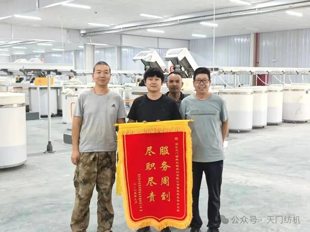 “服務(wù)周到,盡職盡責”,這是天門紡機新疆客戶圖木舒克市前海棉紡織有限責任公司送給90后售后服務(wù)工程師李迎新的錦旗贈言。短短八個字,既是肯定,又是褒揚。